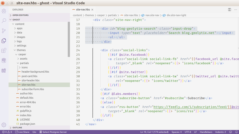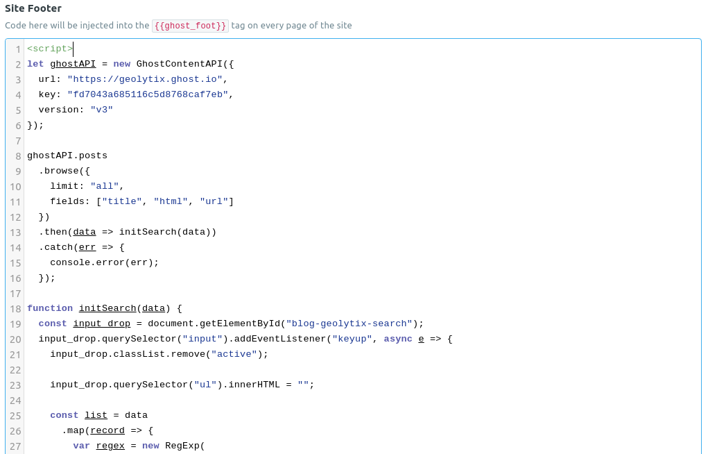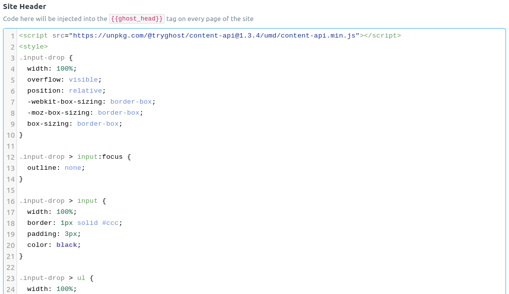 Let’s put the styles (for the input and drop down) and the script import in the ghost header.